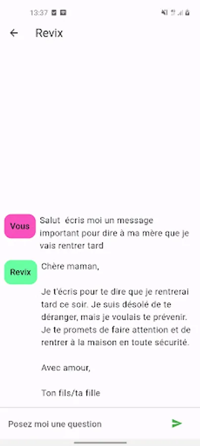 Note that this is a computer program and that it can sometimes give answers that are not fully adapted to your questions, so be careful when using this application.