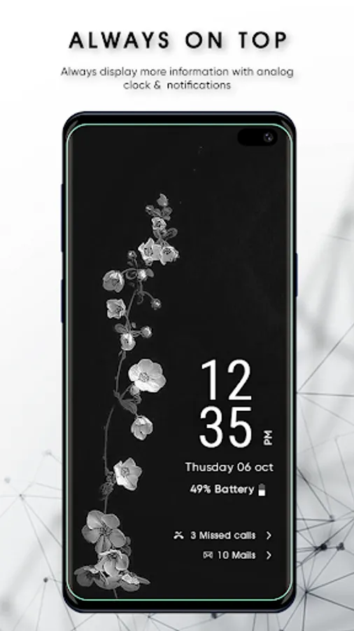Always on top gives data about, time, date, warnings and more and all without contacting the telephone. To save battery progressing clock setting remains your phone screen dim beside several pixels to show progressed clock on screen. With Always on top now you don't have to open your portable to see time since its consistently in plain view computerized clock and show clock on screen.