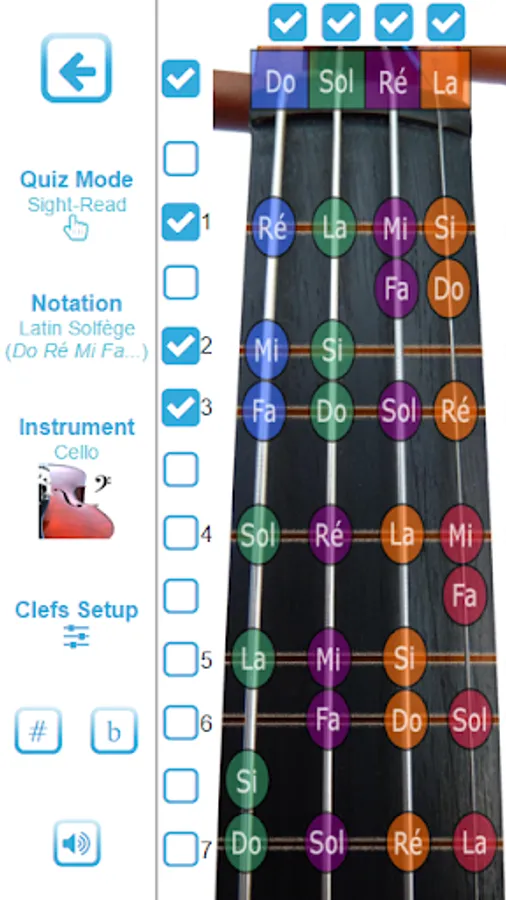 → Sight Read Quiz (touch) : Read the staff note, then touch the right spot on the screen's fingerboard.