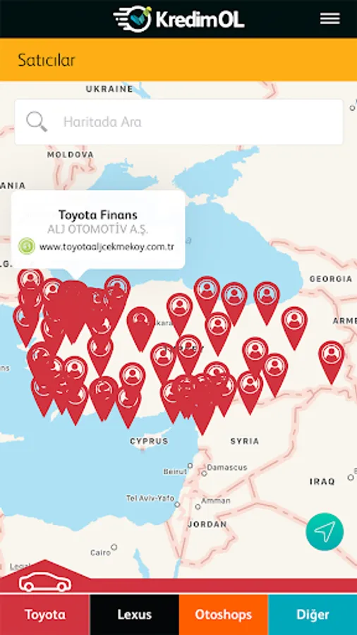 You can view the nearest cooperated dealers of Toyota Finans, Lexus Prime Finace and Otoshops Finans on Turkey map.