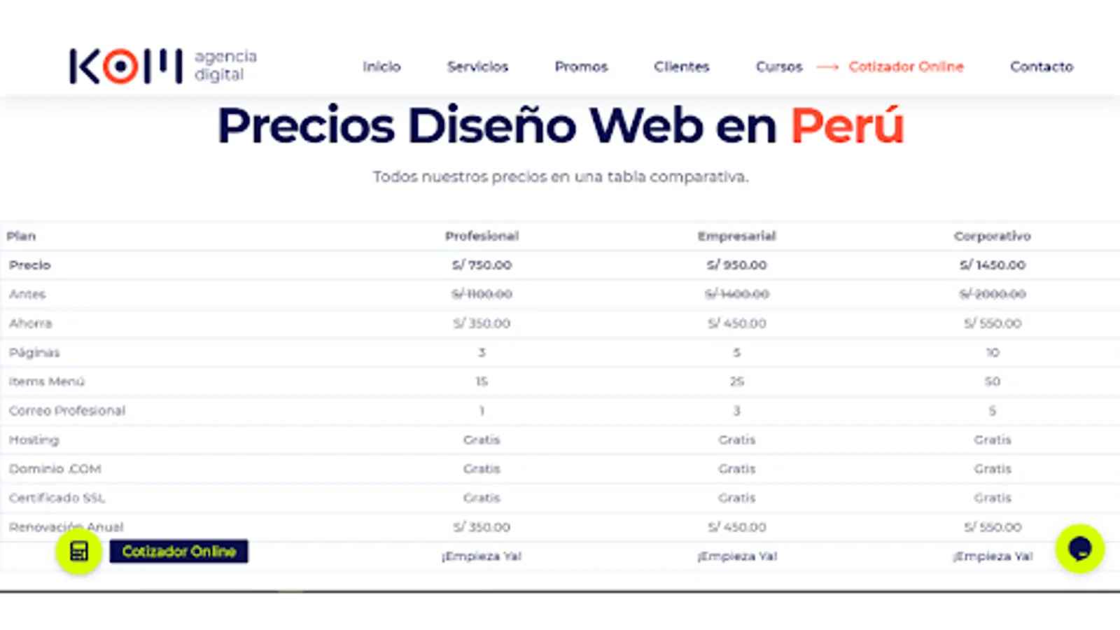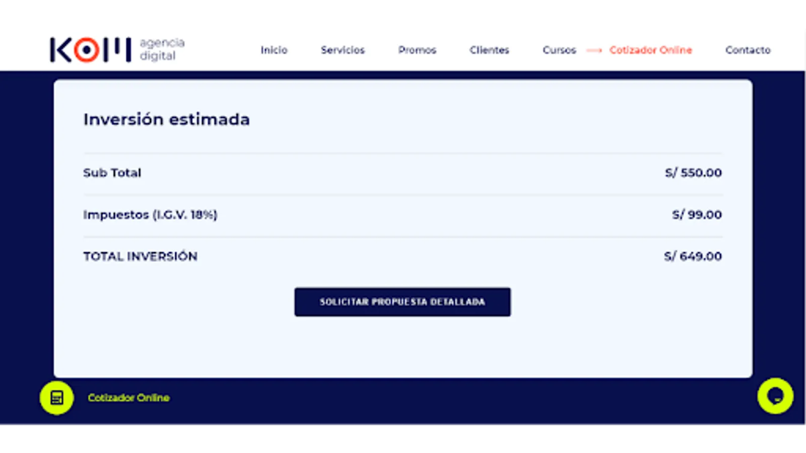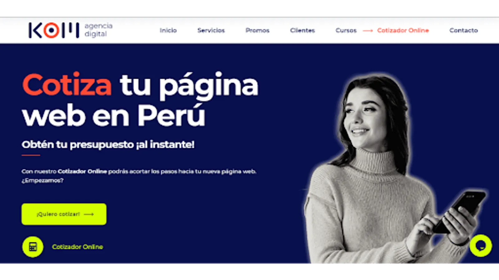 Peruvian Digital Agency specialized in creating pages optimized with SEO (Search Engine Optimization). In this app you will find our prices, clients and services that we provide in addition to our powerful Online Quote, which after selecting a few simple options, will send you a detailed quote to your WhatsApp of our Design and web positioning services, personalized and instantly. Prices are in Peruvian Soles.