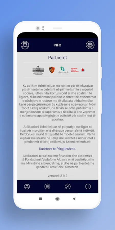 Ky aplikacion ESHTE krijuar me qëllim për të inkurajuar pjesëmarrjen and qytetarit nė përmirësimin and social sigurisë, luften ndaj korrupsionit is dhe zbatimit tė ligjeve, duke ndihmuar policinë and Shtetit nė evidentimin and çështjeve dhe rasteve me të cilat ata përballen dhe Kane përgjegjësinë për you kujdesur and ndërvepruar.
