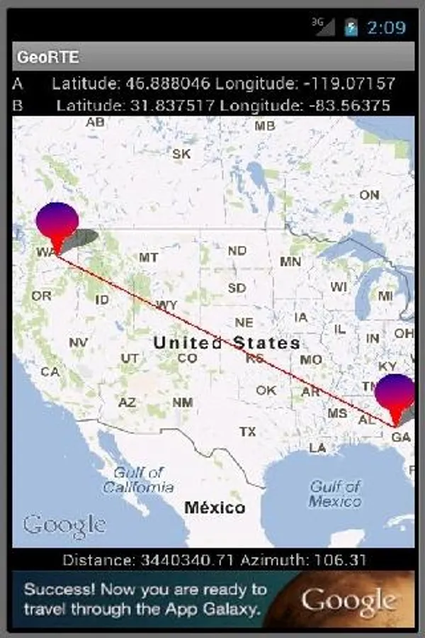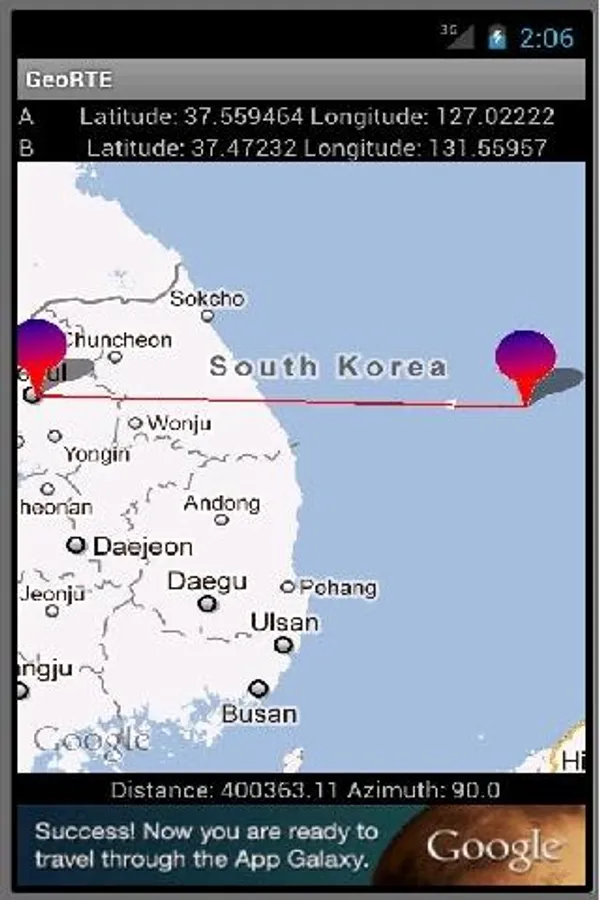 This application shows distance and azimuth between departing and arriving point, which was pointed by users on the Google map. If you input range and azimuth, this application also shows coordinates of the arriving point.