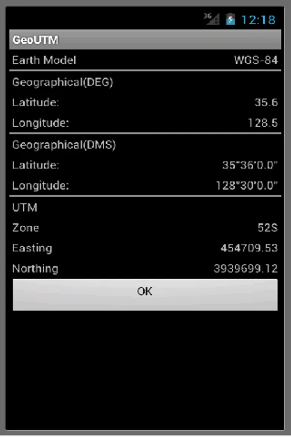 GeoUTM is an Android tool that converts between geographic (latitude/longitude as provided by GPS) and UTM coordinates. Input coordinates can be in Decimal Degrees (DD), Degrees Minutes Seconds (DMS) and Universal Transverse Mercator (UTM). It's an useful tool for map reading and navigation (land or sea navigation).
