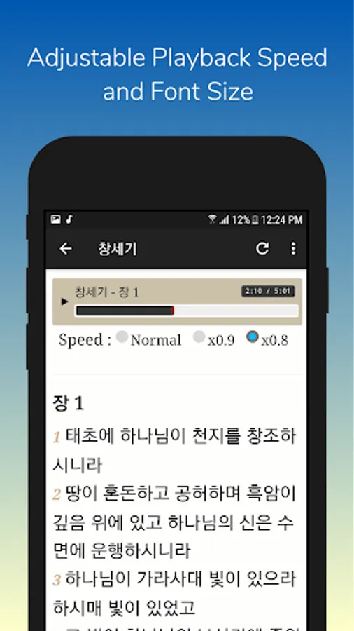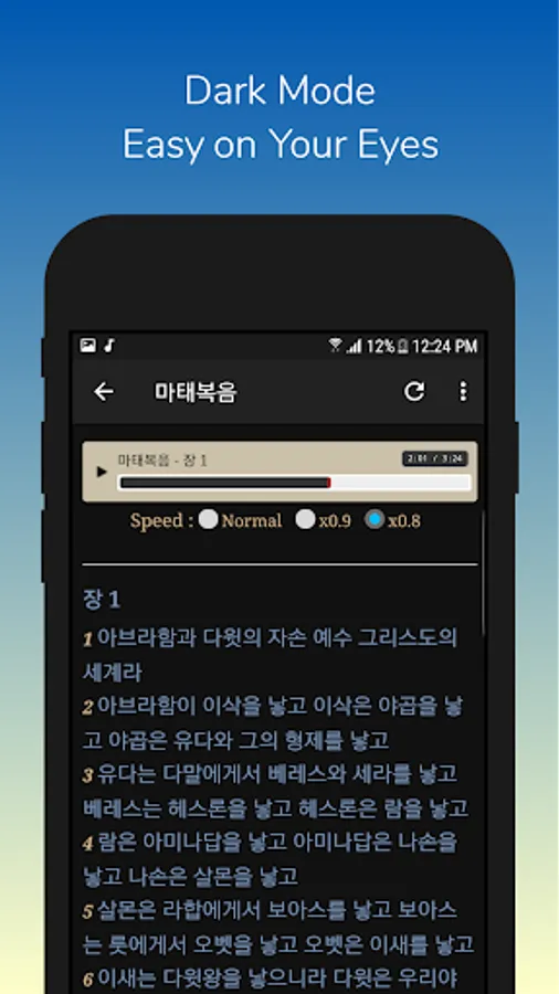Read the Korean Bible on your Android phone! Includes both the Old Testament and the New Testament. This is offline content, so that you can read the scriptures anywhere. This app also includes Korean Bible in audio version for free, all chapters of old and new testament. This application will read the verses for you in Korean language. So with this Korean Bible audio version, you can hear the words of God while you are driving, jogging or when you have no time to sit and read. Audio is online streaming, you should connect to the internet to listen to it. This Korean Bible app is perfect for Korean people who want to learn the Bible in Korean language. You can share your favorite verse with friends via text message, social network or email. With Background Player function, you don't need to open the app screen all time to listen to your favorite verses. Bible on your phone. No more book. Portable to use. Bible can go with you everywhere.