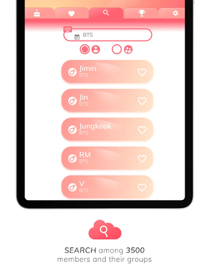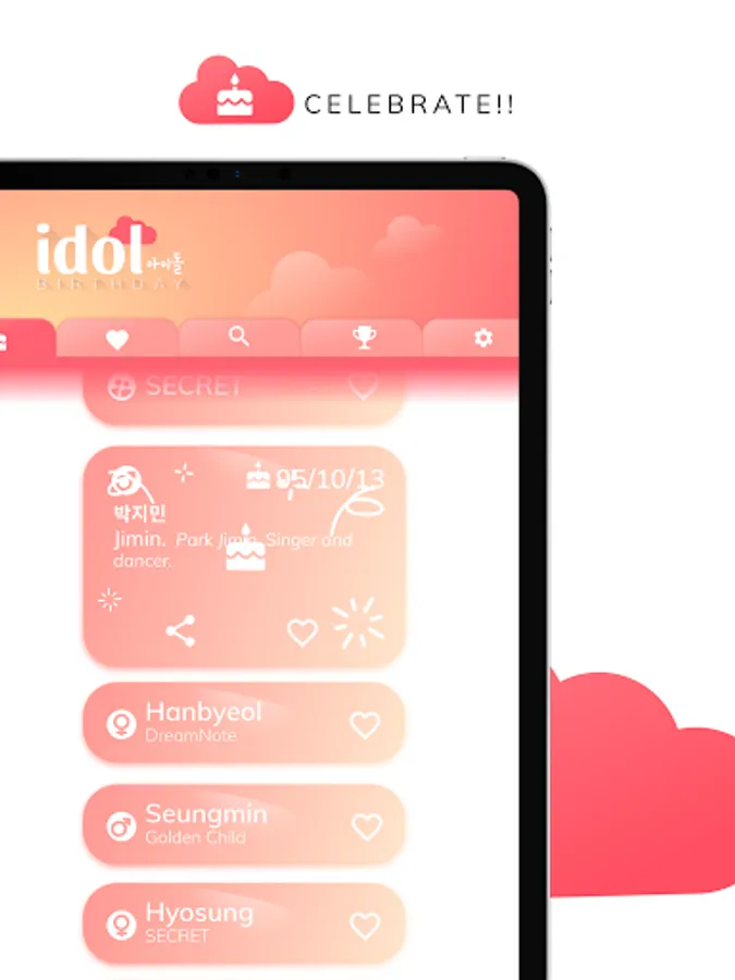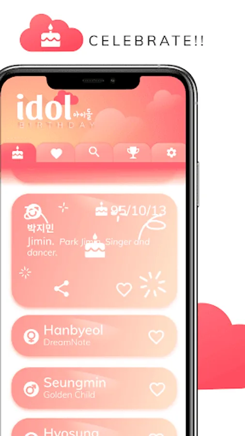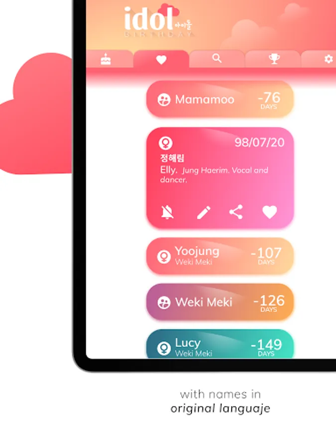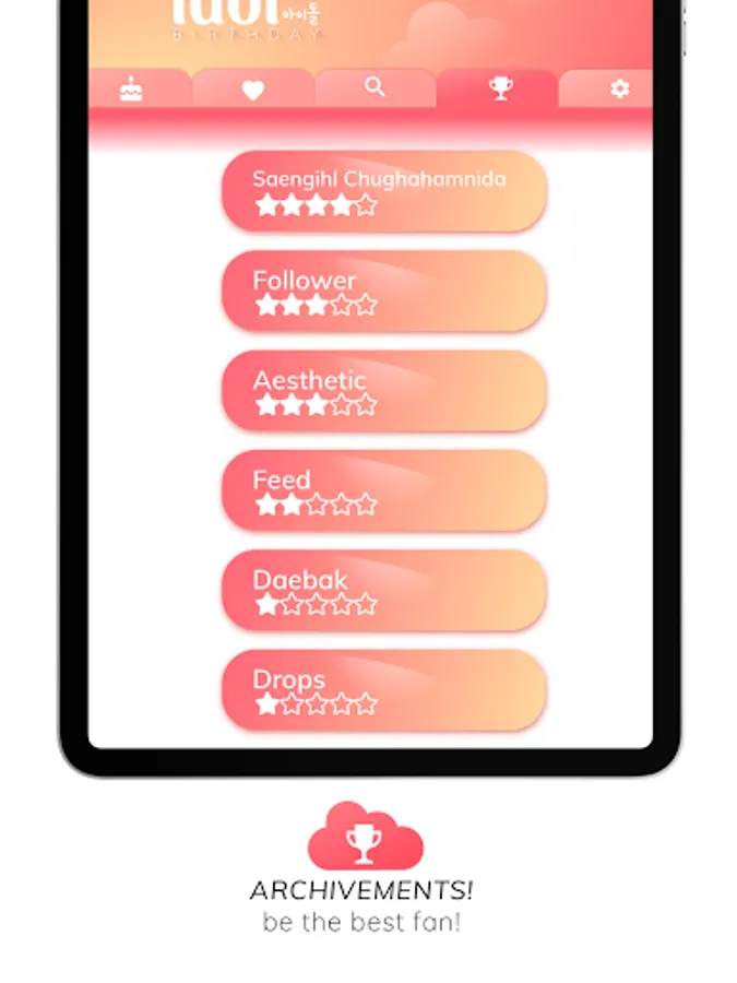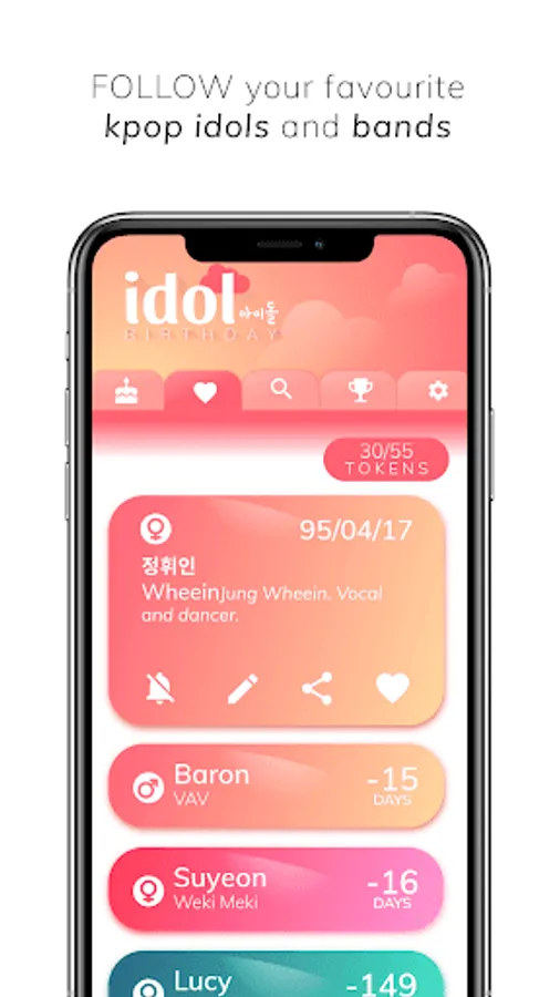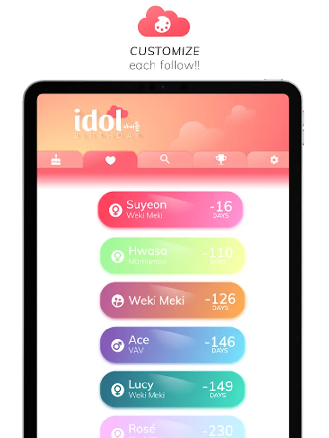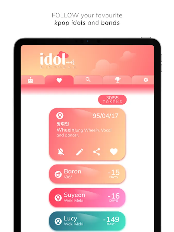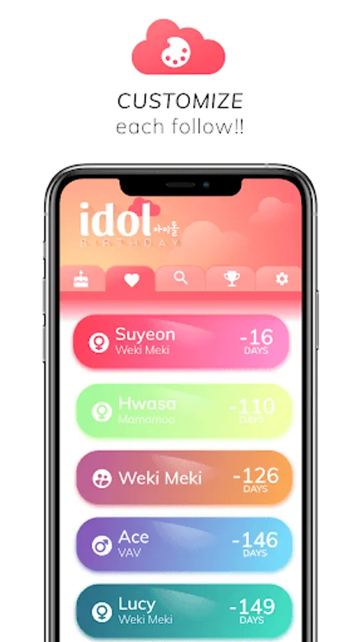Set up a countdown for all of the kpop idols you follow and you won't miss another happy birthday again! This is the ultimate korean kpop idol birthday reminder countdown app but, if you are not sure of that, check it out for yourself: the easy design lets you find out new idols each day, you can easily check the birthdays of the current day regardless if you follow them or not. And much more! You can custom the idols' token with different beautiful colors for each one! Try to get all the archivements and prove you are a true fan!