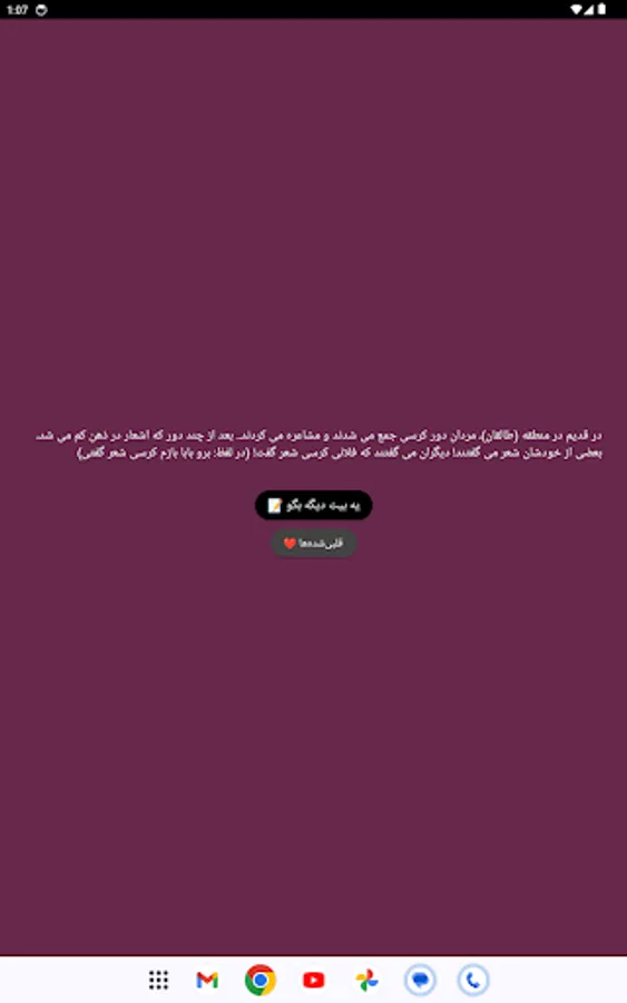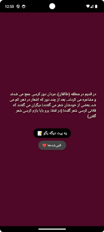 Indulge in the mesmerizing world of Persian poetry, where emotions flow like rivers and insights shine like stars. Whether you're seeking solace, inspiration, or simply a moment of literary delight, our app stands ready to accompany you on this enchanting journey through the heart of Persian literary artistry. Download now and embark on a voyage that transcends time, culture, and technology. 🚀📜🌌