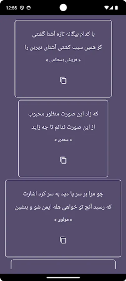 Unearth the gems of Persian literature with a single tap. Our app presents you with a handpicked selection of random poems, each encapsulating the depth of emotions and wisdom expressed by poets like Rumi, Hafez, Saadi, and more. With every new poem, you'll find yourself transported to a world of eloquence and insight. 🌟