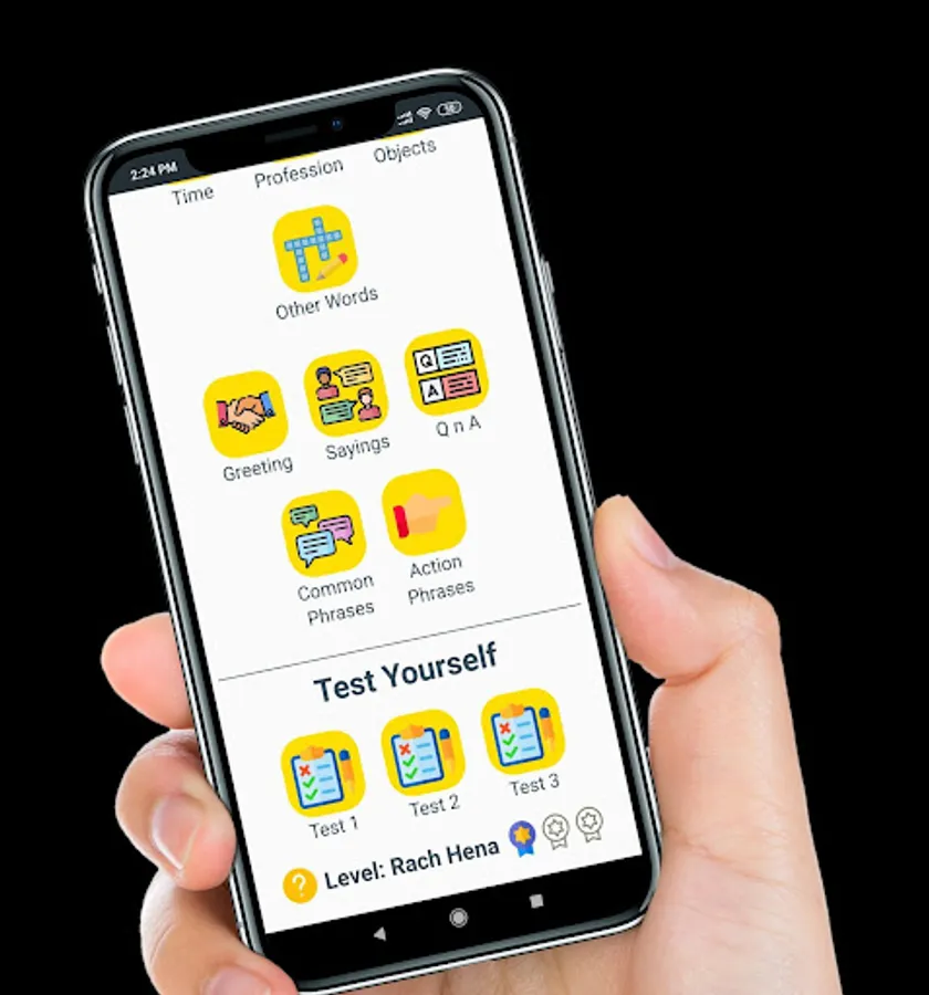 This app has simple flashcard categorised into various sections for common words and phrases including: