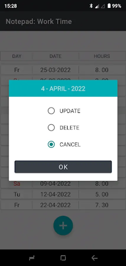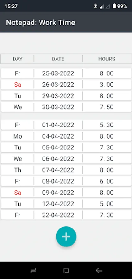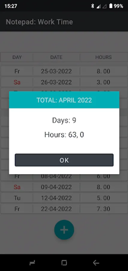 Notepad will help you keep accounting hours. Displays the date and number of hours per day, the same amount of all working days and all working hours for the month.