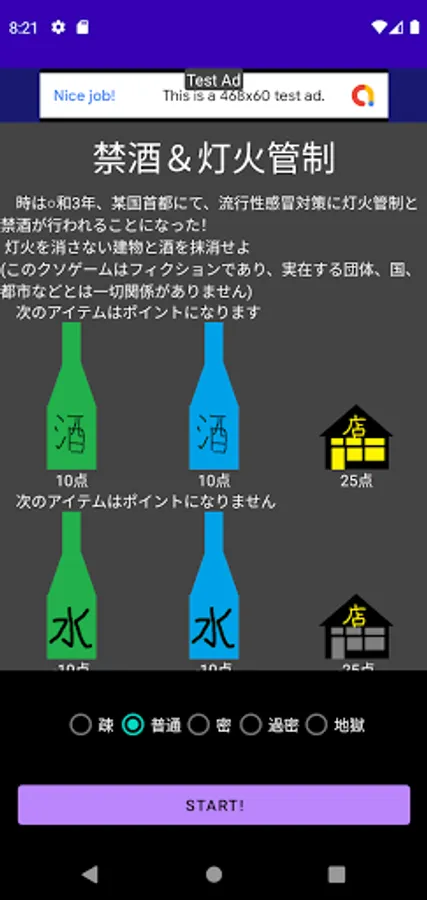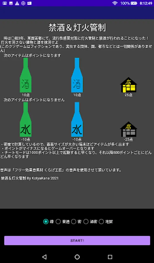 The difficulty level can be selected from "Sparse", "Normal", "Dense", "Overcrowded", and "Hell".