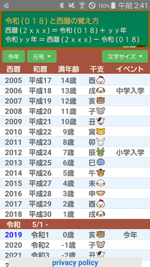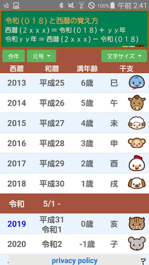The year, Japanese calendar, age, zodiac are displayed in a list format.