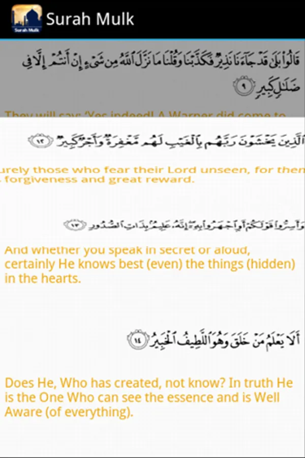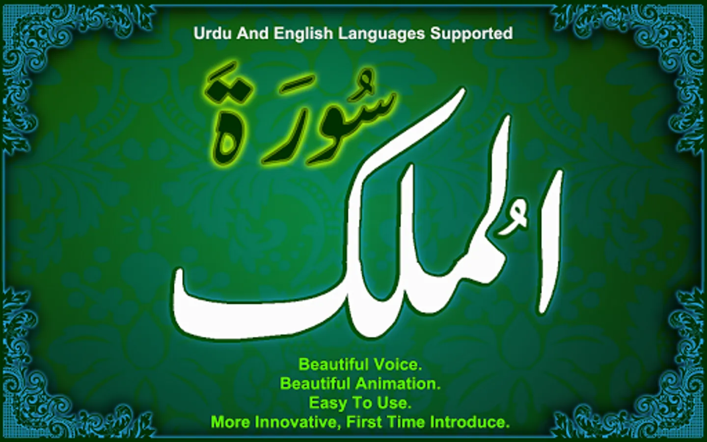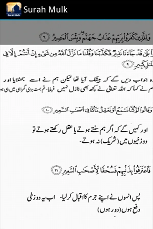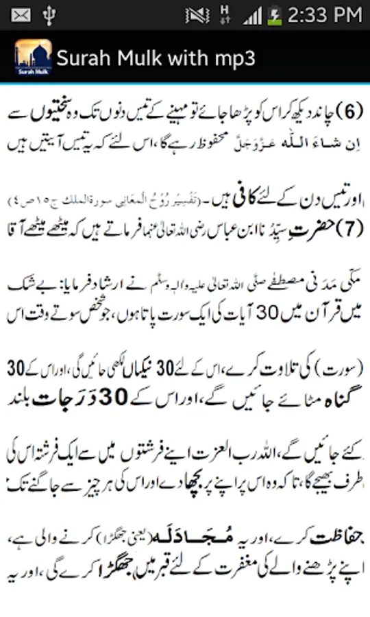 • It includes audio/mp3 and written text of Surah Mulk along with the translation /tarjuma – available in both English and Urdu.