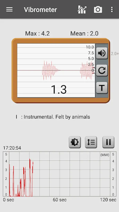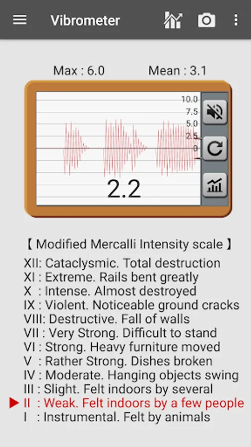 The measured values are related to Modified Mercalli Intensity scale (MMI). If it is inaccurate, you can calibrate it so that maximum value is about 10-11. Please use it as an auxiliary tool.