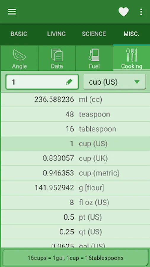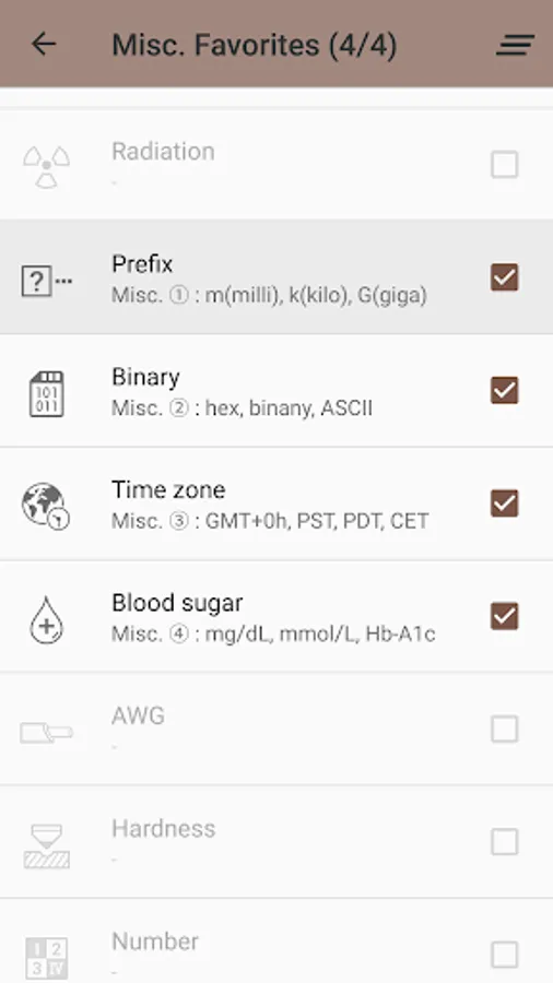 - Misc. : angle, data, fuel efficiency, cooking, illuminance, radiation, prefix, binary, time zone, blood sugar, hardness, AWG