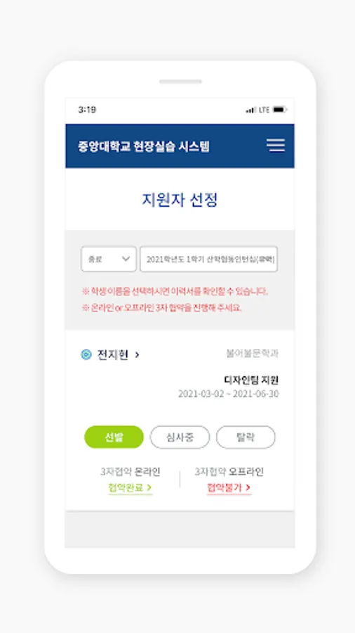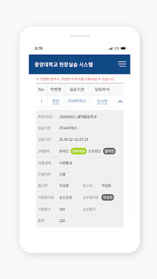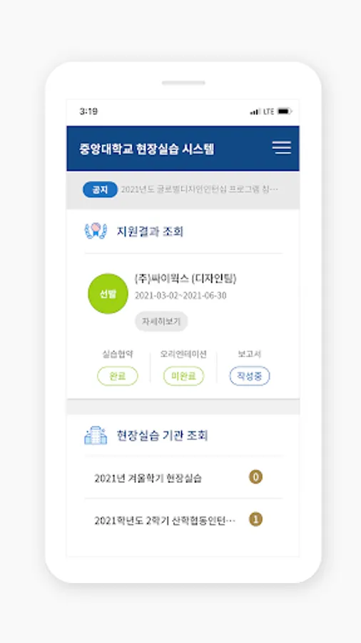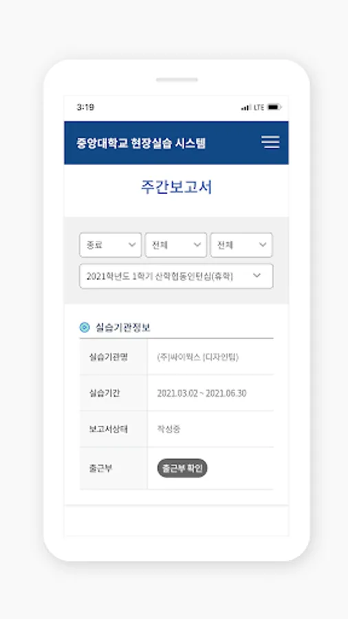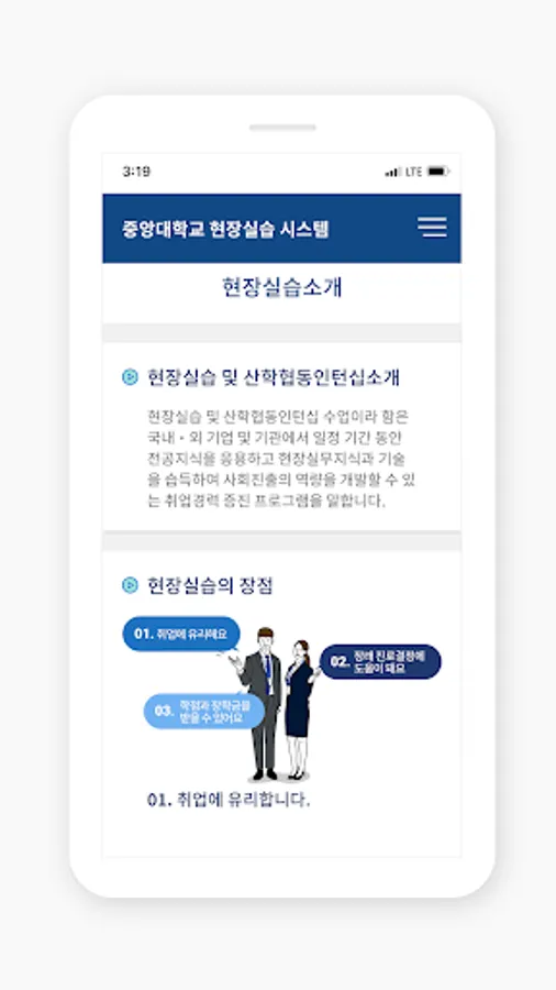 As the official app serviced by Chung-Ang University Linc+ project group, it provides various services such as application for field training semester system participation, resume writing, attendance record, evaluation writing, and review of practice review.