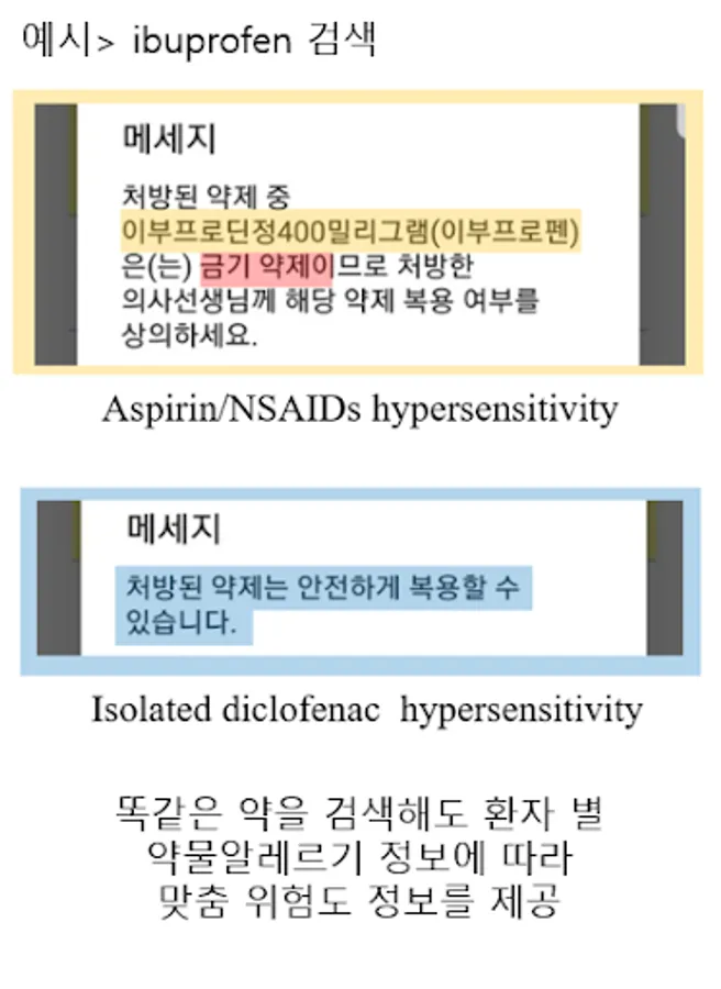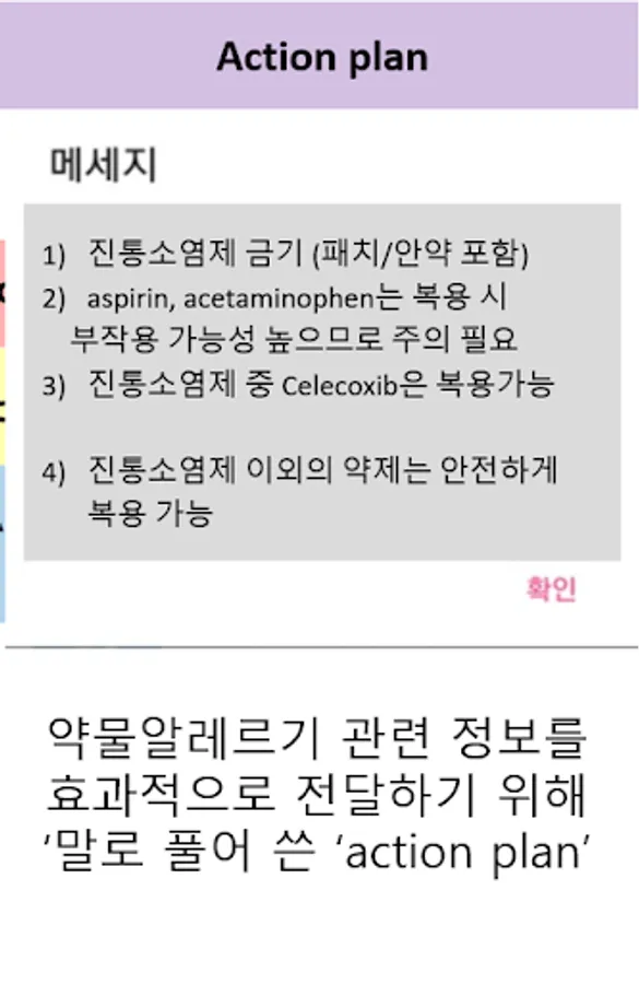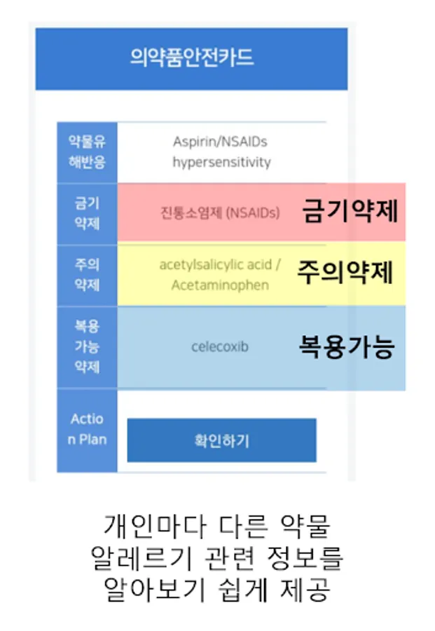 The'Drug Allergy Alert' application includes 1) mobile drug safety card, 2) drug allergy action plan, 3) search if a specific drug is safe, and 4) check whether allergy-causing drugs are contained through a QR code. .