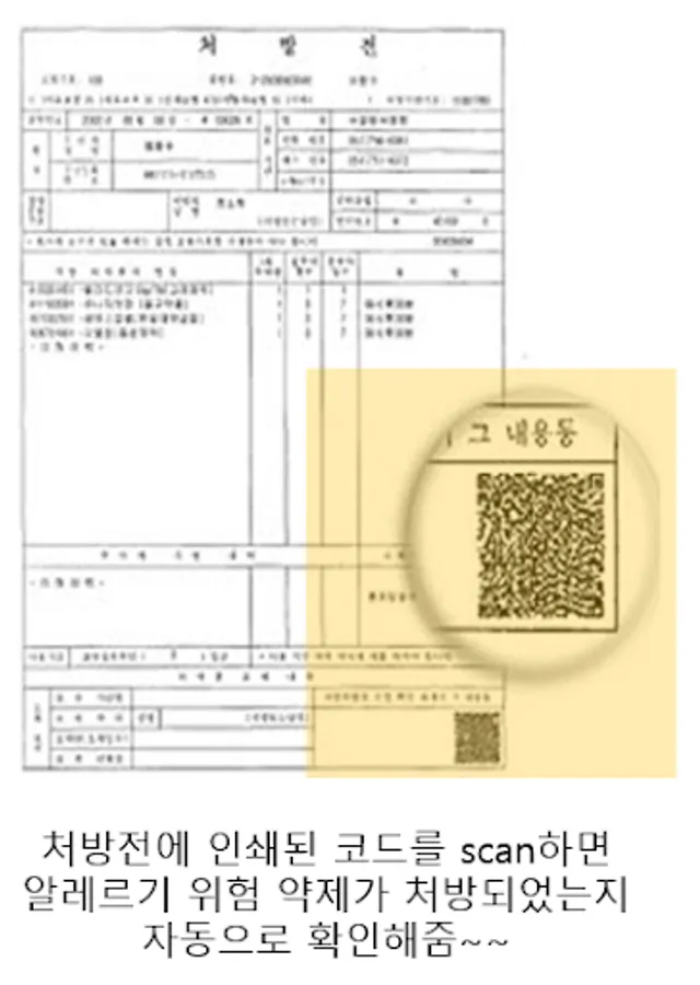* The 2D barcode/QR code scanning function implemented in the'Drug Allergy Alert' app is a function implemented by cooperating with the technology after understanding the public interest nature of this task at Ubicare Co., Ltd./EDB Co., Ltd.