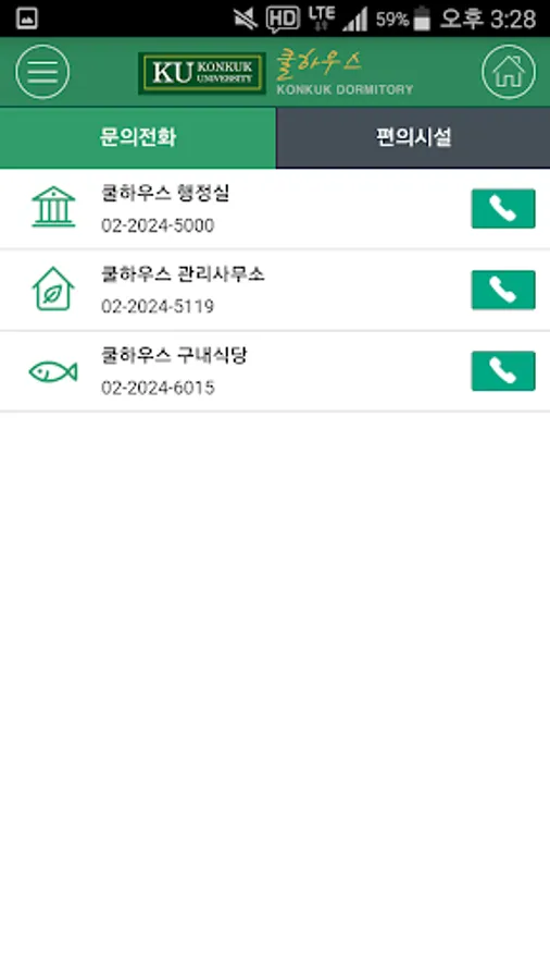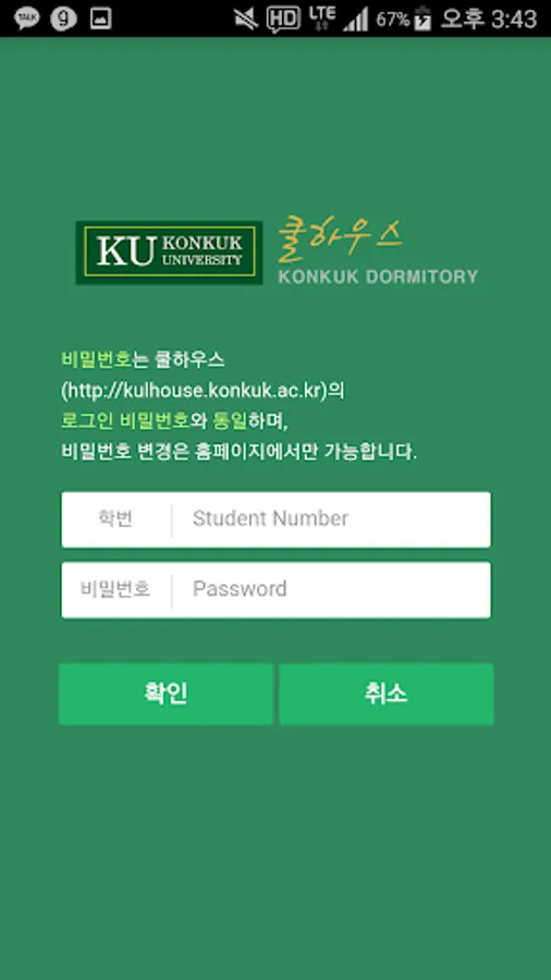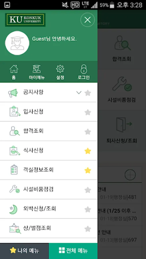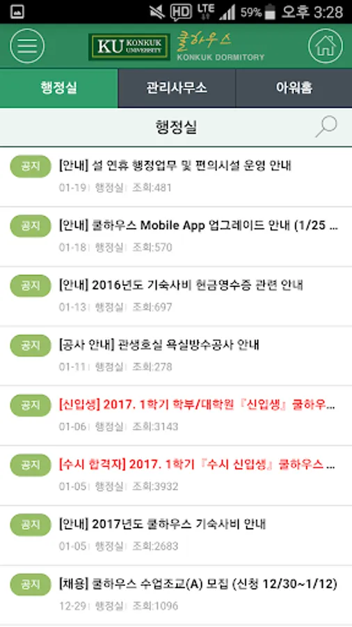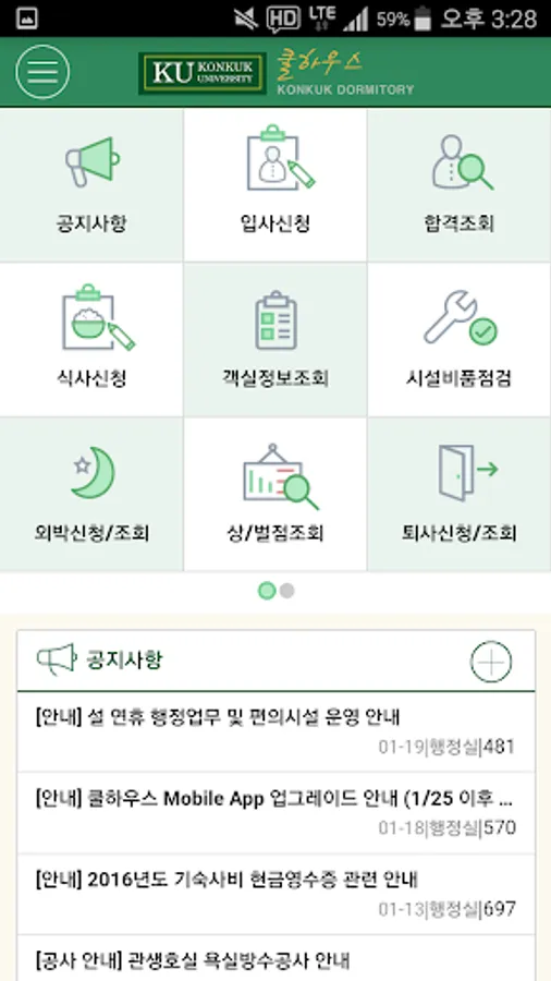 It offers features such notice, apply to a sleepover at Konkuk University gwansaeng Cool House.