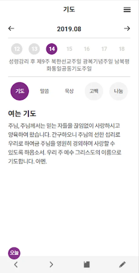 오늘과 과거의 일자의 여는 기도를 확인할 수 있습니다.