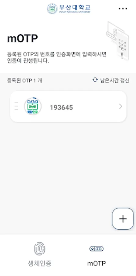 Pusan National University integrated authentication app provides biometric authentication and mobile OTP authentication service.