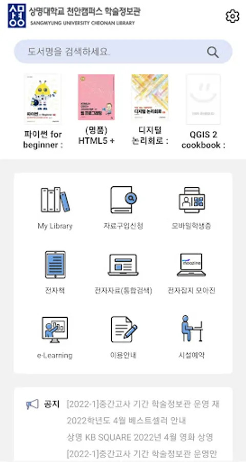 Through the Sangmyung University Cheonan Campus Academic Information Center app, you can use the same services provided by the library, such as usage guide, integrated search, book rental inquiry, postponement request, and reservation, anytime, anywhere.
