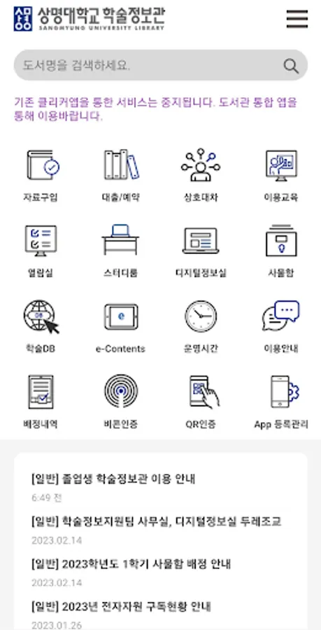 Through the App, you can use the same services provided by the library, such as user guide, integrated search, book rental inquiry and postponement request, and reservation anytime, anywhere.