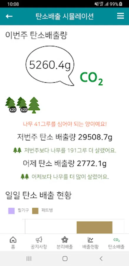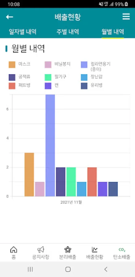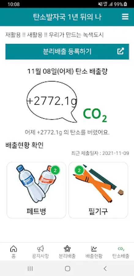 In today's society, it is inevitable not to use disposable products. Our role is to reduce as much as possible and recycle and recycle even when used. Carbon Footprint Mobile (working title) is a household account book-type program that records the garbage discarded by users. You can check your garbage disposal by date, week, and month, compare it with participating groups, and connect with the calculated carbon emission of the garbage. Reducing or recycling can determine the added value of each waste, such as items with a large carbon reduction effect and items that do not need to be recycled.