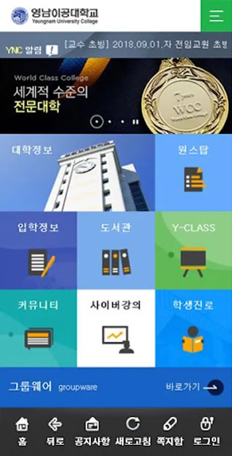 영남이공대학교 구성원들의 편의와 대학 홍보를 위해 제작된 영남이공대학교 공식 모바일 어플리케이션으로 다음과 같은 기능을 제공하고 있습니다. (인증에 필요한 서비스의 아이디와 비밀번호는 종합정보포탈시스템과 동일합니다.)