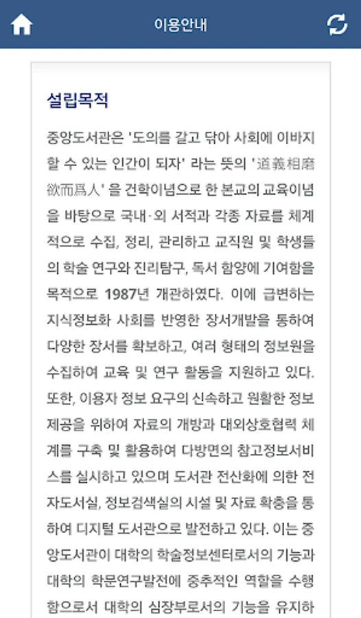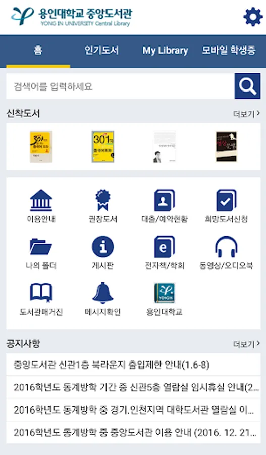Through the App, you can use the same services provided by the library, such as user guide, integrated search, book rental inquiry and postponement request, and reservation anytime, anywhere.