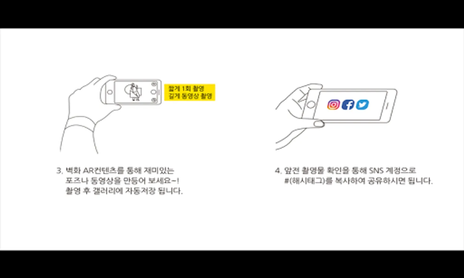 • AR (augmented reality) technology is an application applied to the mural. When shooting, it is automatically saved in the gallery, and you can share it to the SNS to which you are subscribed through the share button.