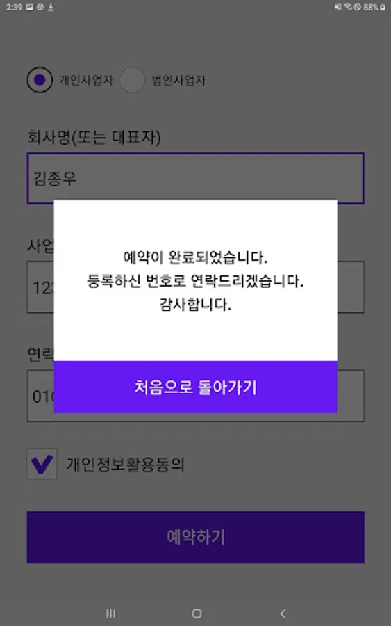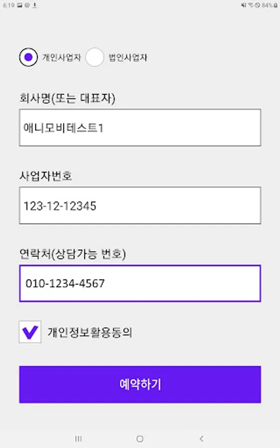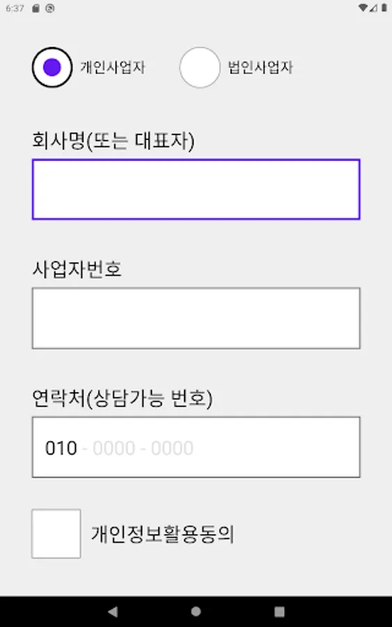 1. 개인/법인 구분, 회사명(또는 대표자명), 사업자번호, 연락처 입력