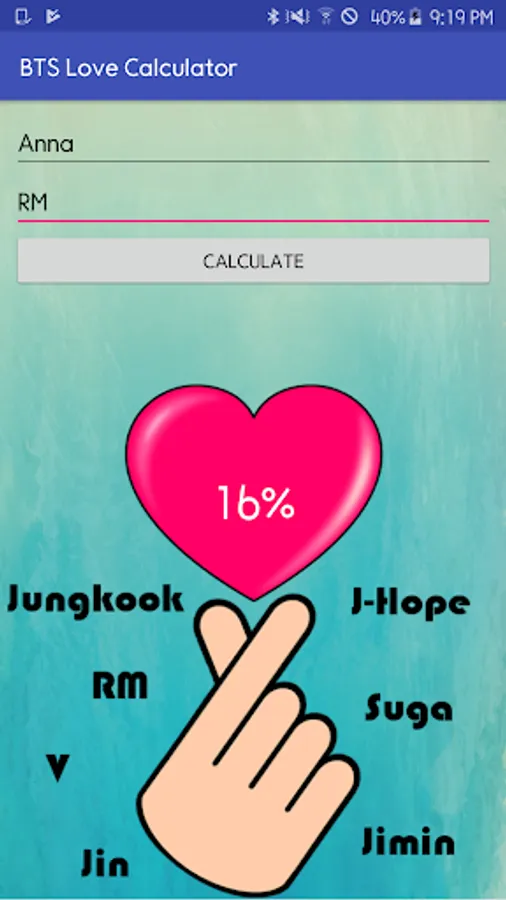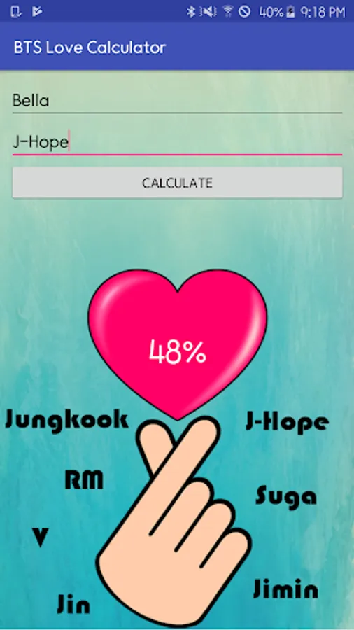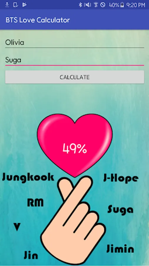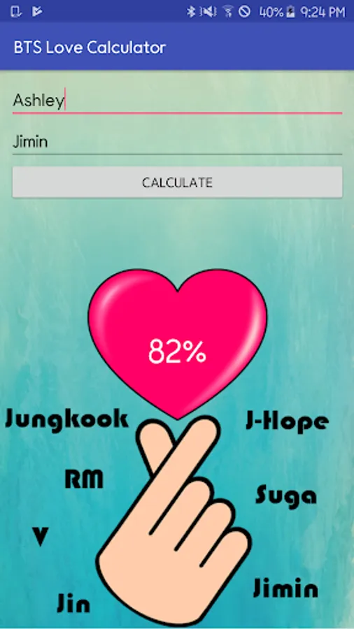 - Enter your name and the name of your BTS crush to find out if it is true love!