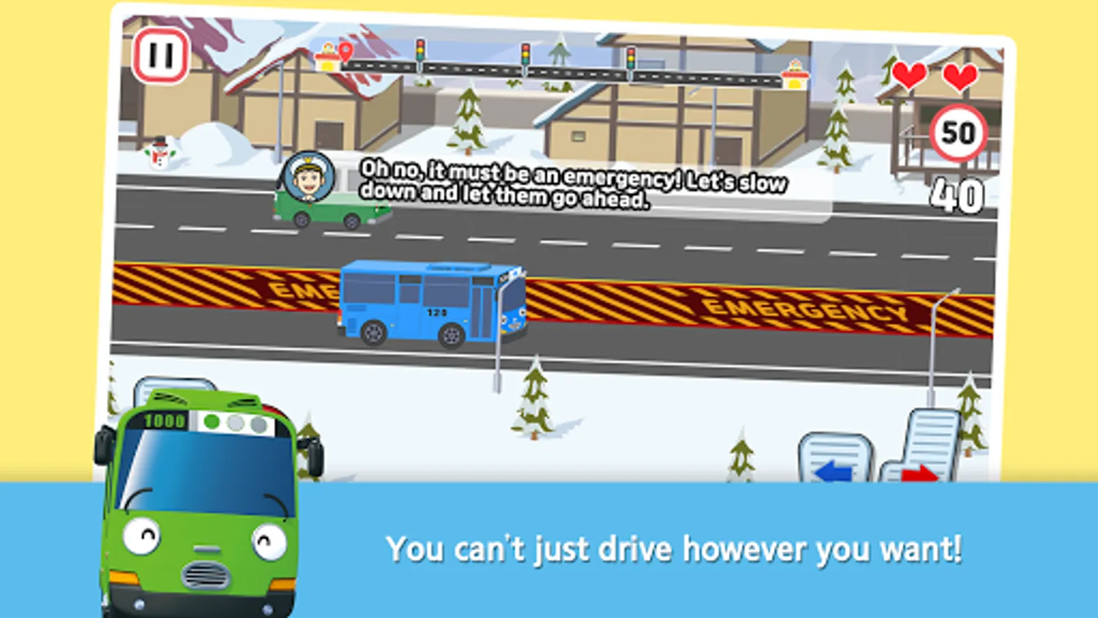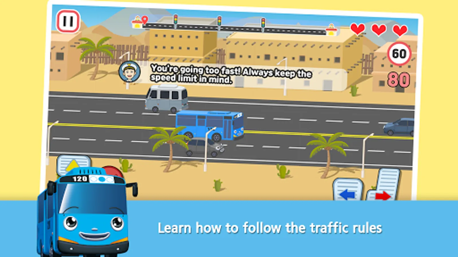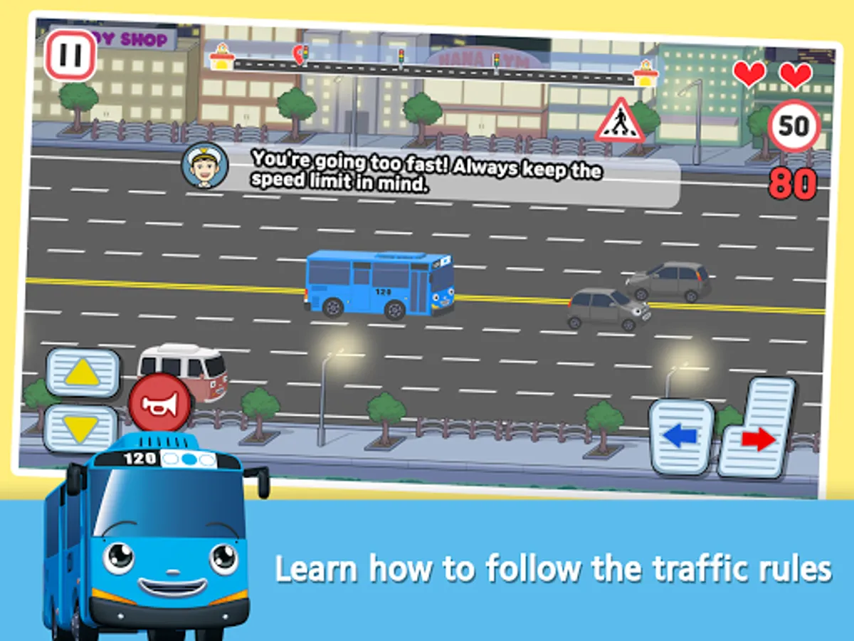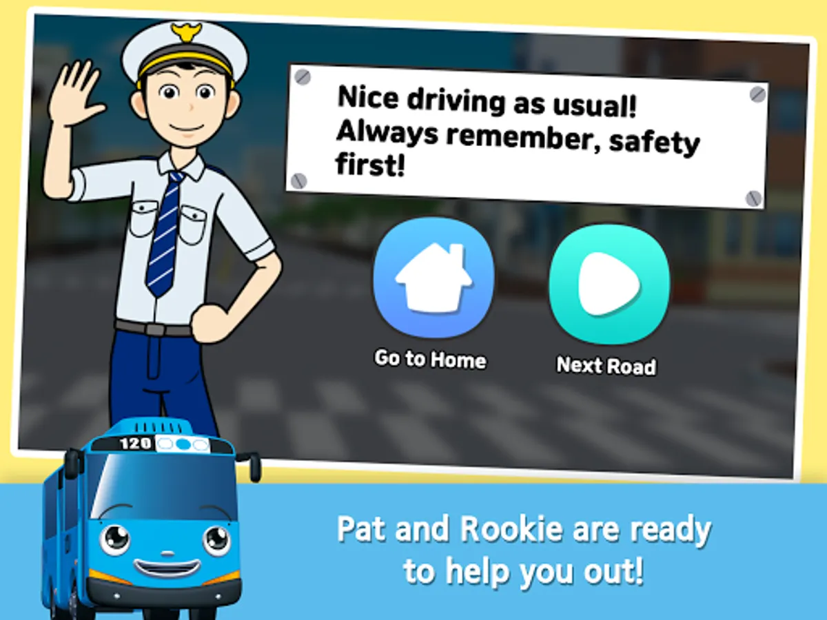 - You can’t just drive however you want! Drive the little buses safe until the point of arrival following the traffic safety rules. You don’t know the rules? Not a problem! Pat and Rookie are out there ready to teach the rules and help you out!
