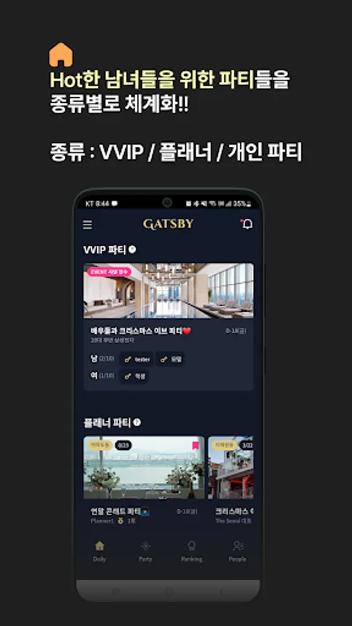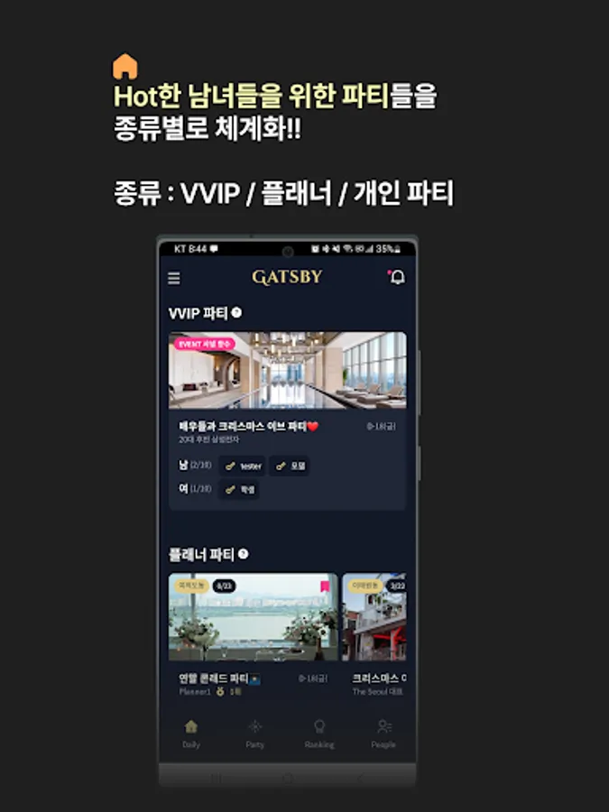 Gatsby classifies and manages three types of parties: VVIP party, planner party, and individual party. The VVIP party is held only once a month under the approval of our management team at carefully selected locations (ex: Signiel Hotel), free gifts for participants over a certain amount (ex: Chanel perfume), and top-notch attractive men and women (ex: actors, It is a small party between influencers). Planner's Party is a medium to large-scale party hosted by professional planners affiliated with Gatsby. Lastly, the private party is a small party held impromptu by the general members (ex: A 2:2 drink at Apgujeong Izakaya this weekend).