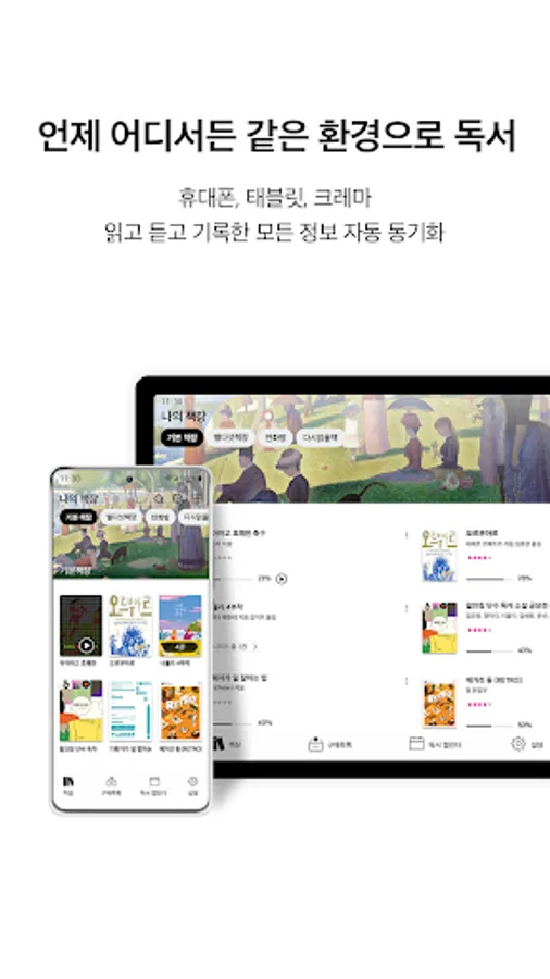 You can freely read e-books on up to 5 devices per account, and the automatic synchronization function allows you to synchronize 'scrap information such as bookmarks/memos' and 'read page information' anytime, anywhere while using multiple devices.