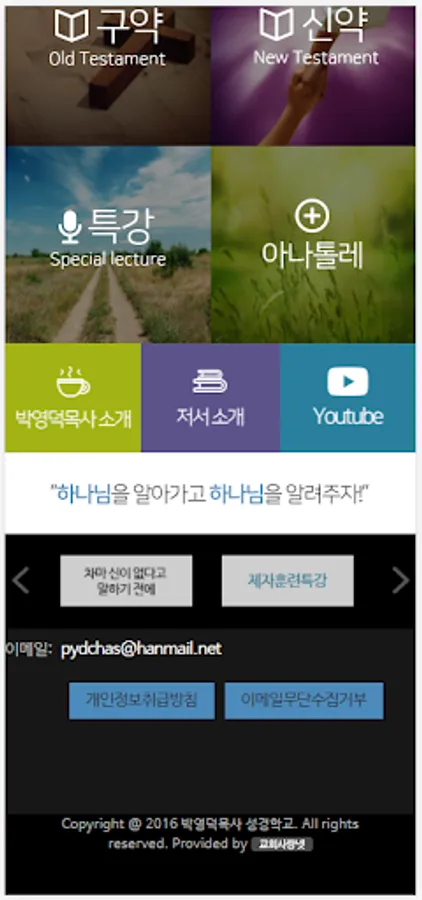 He deeply realized the importance of Bible study while serving college students, young people and the Korean church, and in order to spread the words of the Old and New Testaments to the Korean church, he preached sermons in all 66 books and made them into videos. Those who want to learn the Bible can easily listen to and learn the entire Bible through Pastor Youngduk Park Bible School.