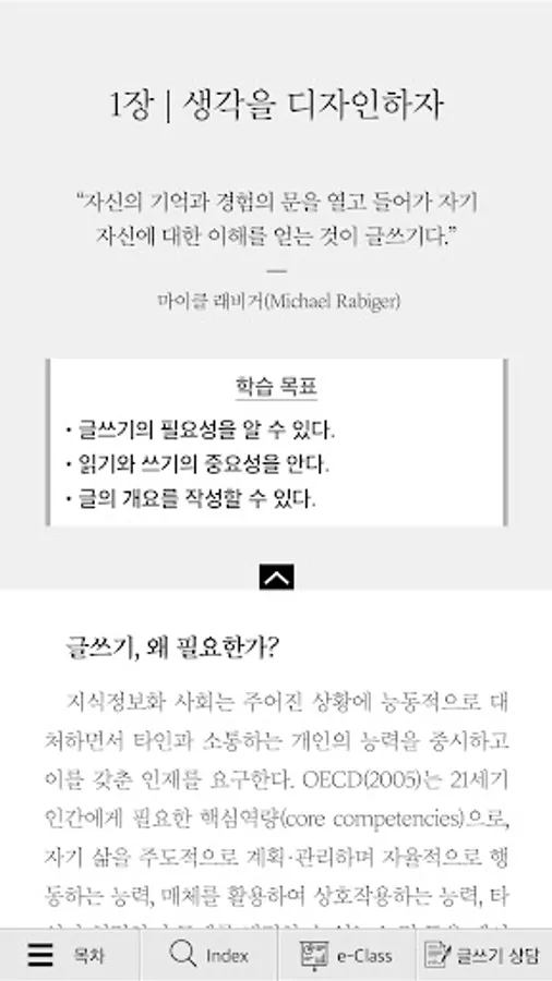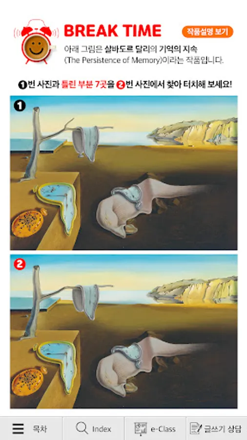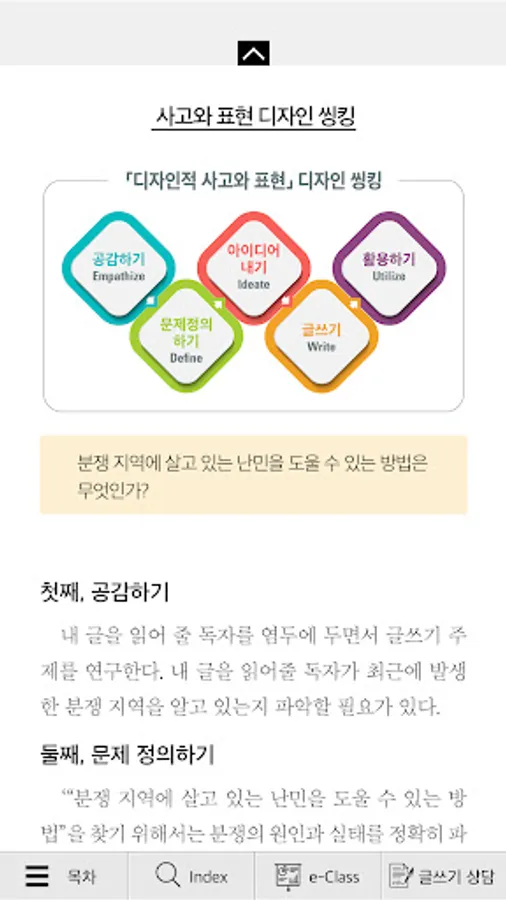 This app was created for the purpose of developing the ability of college students to look at problems from an original point of view and creatively solve problems through an integrated thinking process. It is designed for the mobile environment so that you can see the contents by flipping left and right like a paper book and scrolling from top to bottom. Also, find the difference game content is provided with a break time page for you to take a break. Through this app, you can read texts on various topics, find problems, go through the design thinking process, and get the results of writing or speaking. Reading, speaking, listening, and writing with creative ideas will help college students improve their multi-literacy skills.