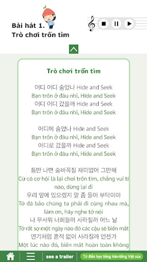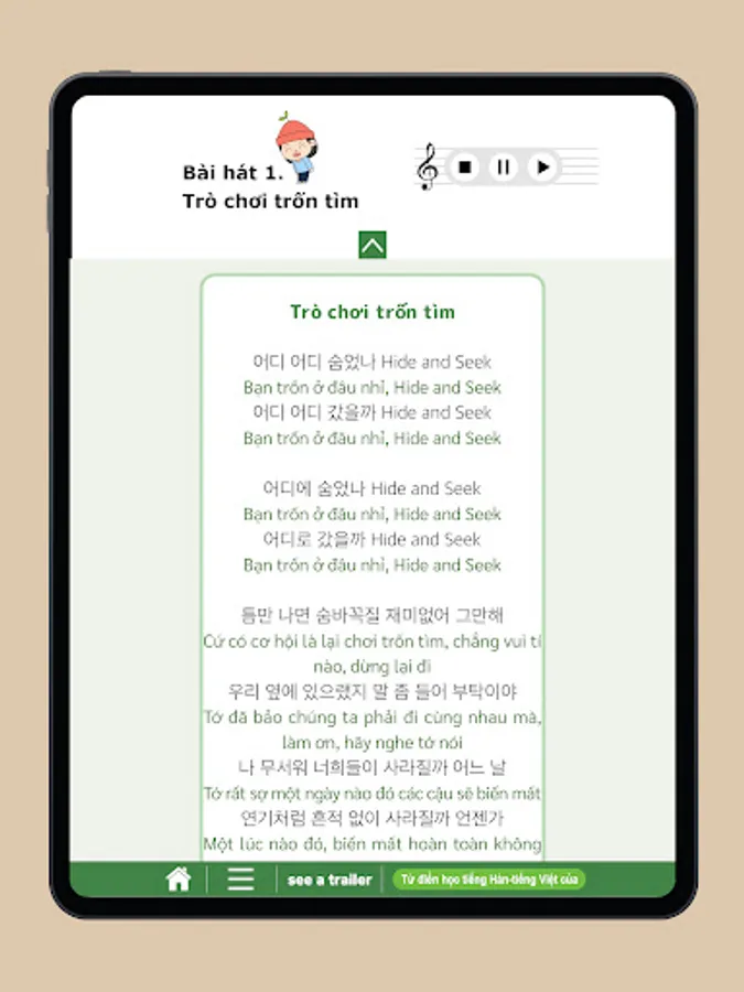 Combining Korean practice with entertainment elements in the musical , the Korean Edutainment e-book application helps Vietnamese students and students who want to learn for the first time. Korean language feels more interesting, listening and learning Korean naturally.