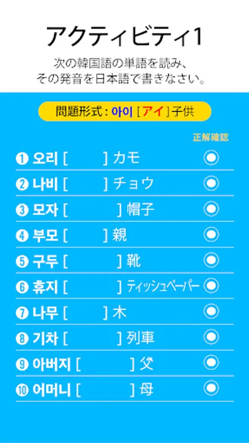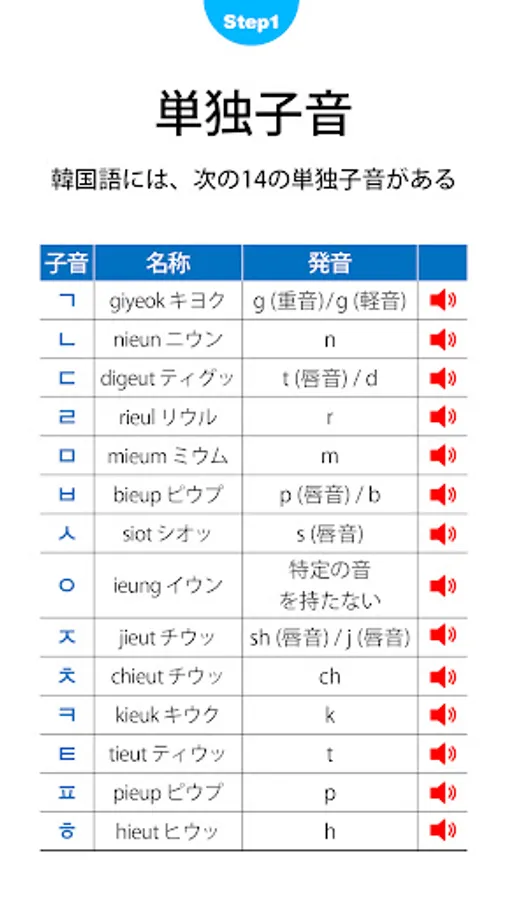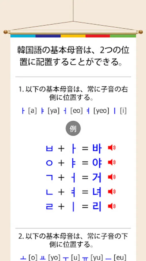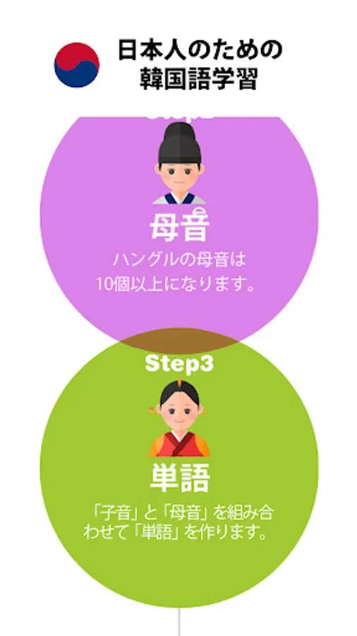 日本人韓国語教育アプリは、韓国語文法の基礎となる「端子音」、「主母音」、「単語」の3つの部分で構成されています。