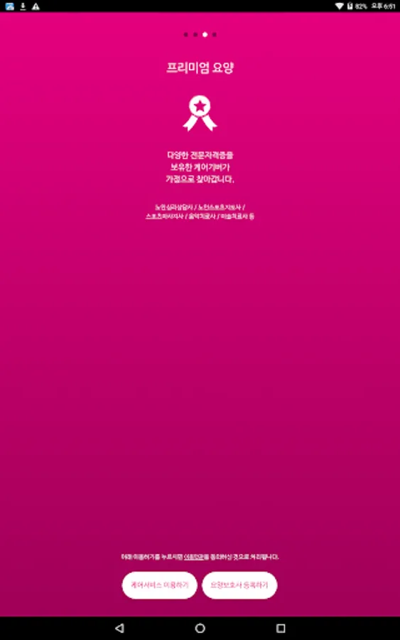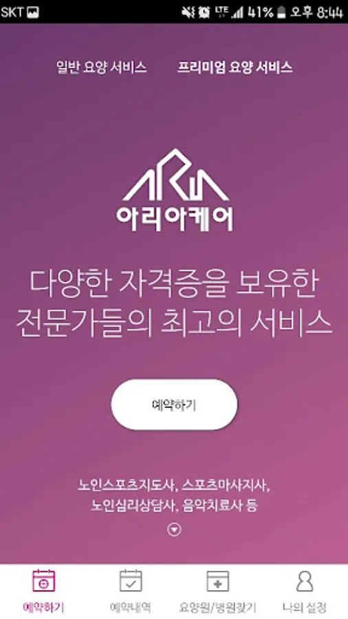 Provides long-term care insurance-based visiting care services and visiting bathing services for the elderly. In addition to government support, use premium nursing services as well. Through consultation with a professional social worker, you can receive counseling about necessary nursing services and receive customized services. Ariacare provides high-quality care services anywhere in the country based on Ariacare home care institution affiliate centers that provide the best care services. Consult with a professional social worker through the Aria Care app for senior long-term care insurance level consultation, nursing service consultation, visit care, visit bath, premium care service, and home care. We also provide a service to find excellent nursing homes and nursing hospitals. You can view and compare excellent nursing homes and nursing hospitals (nursing facilities) certified by Aria Care for consultation. Nursing facilities, trust and choose now.