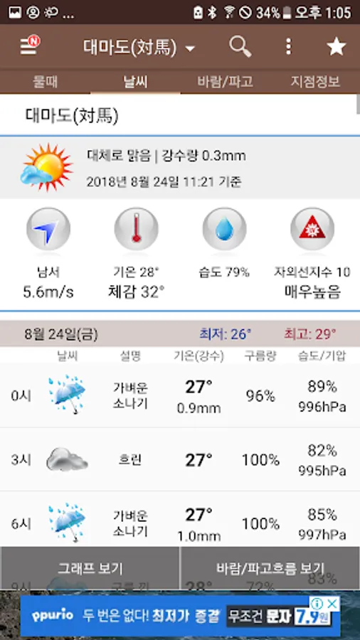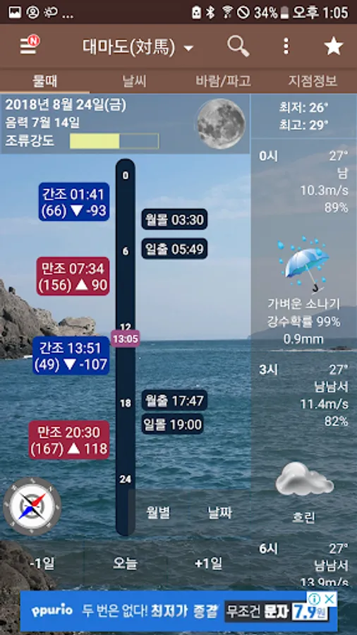 Tide (tidal forecast and tide information) - Tide table, high tide time and tide change, tide observation information (tidal level, water temperature, wind direction, temperature, wind speed, atmospheric pressure, salinity, sunrise/sunset time)