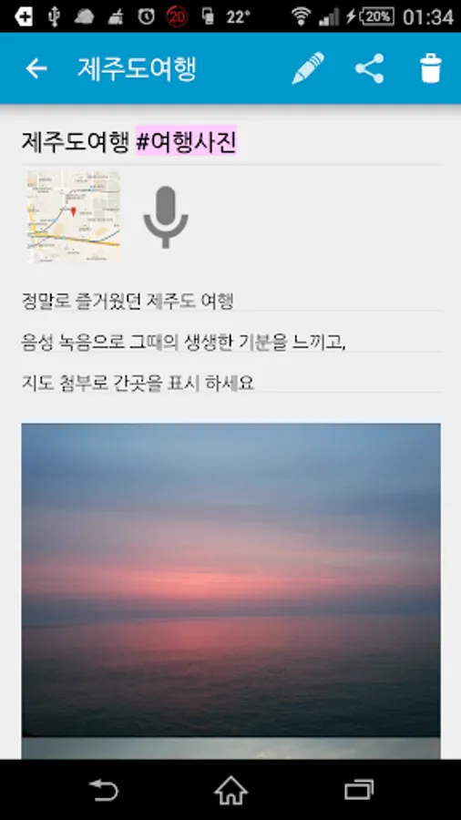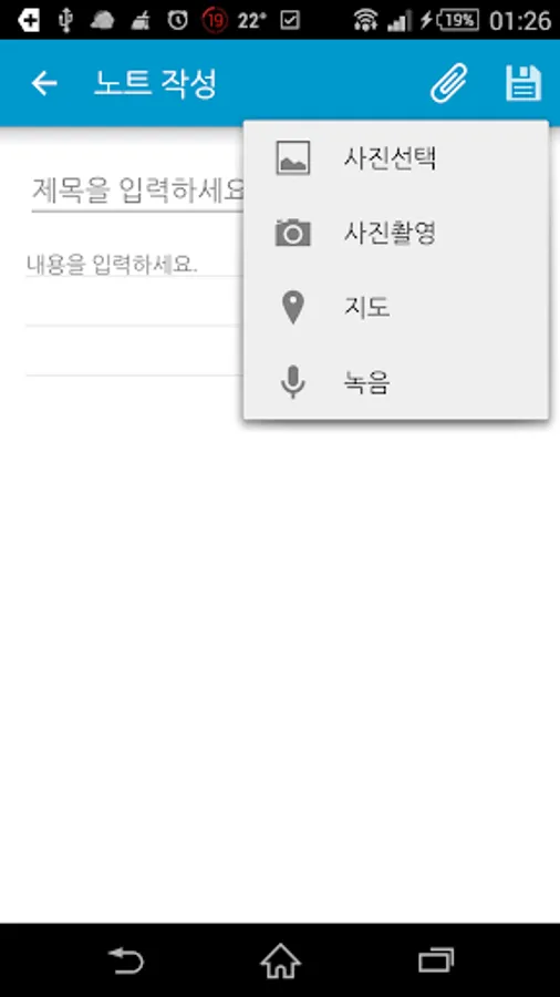 step2. 분류가 세팅되었으면, 글쓰기를 시도해 보세요. 텍스트, 사진, 지도, 녹음을 첨부하여 기록할수 있습니다.