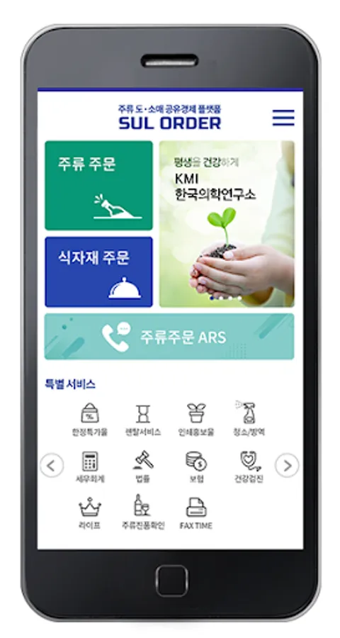 주류 도소매업자를 위한 공유경제플랫폼 “Sul Order” App은 기존의 주류주문 시스템인 “웹주문”을 Up-Grade하여 보다 쉽게 주류주문 및 거래이력을 한 눈으로 볼 수 있게 하였으며, 특별한 품질, 특별한 가성비, 특별한 신선도의 3특식자재 및 건강검진, 세무회계, 재난배상책임보험(의무가입) 등 다양한 정보 및 서비스를 제공하여 주류 도·소매업자들이 스마트폰 하나로 다양한 비즈니스가 가능하도록 만들었습니다.
