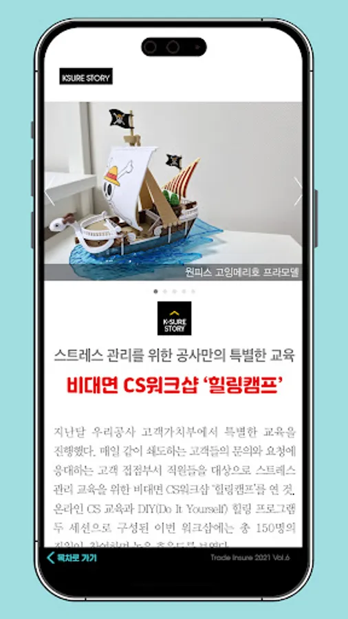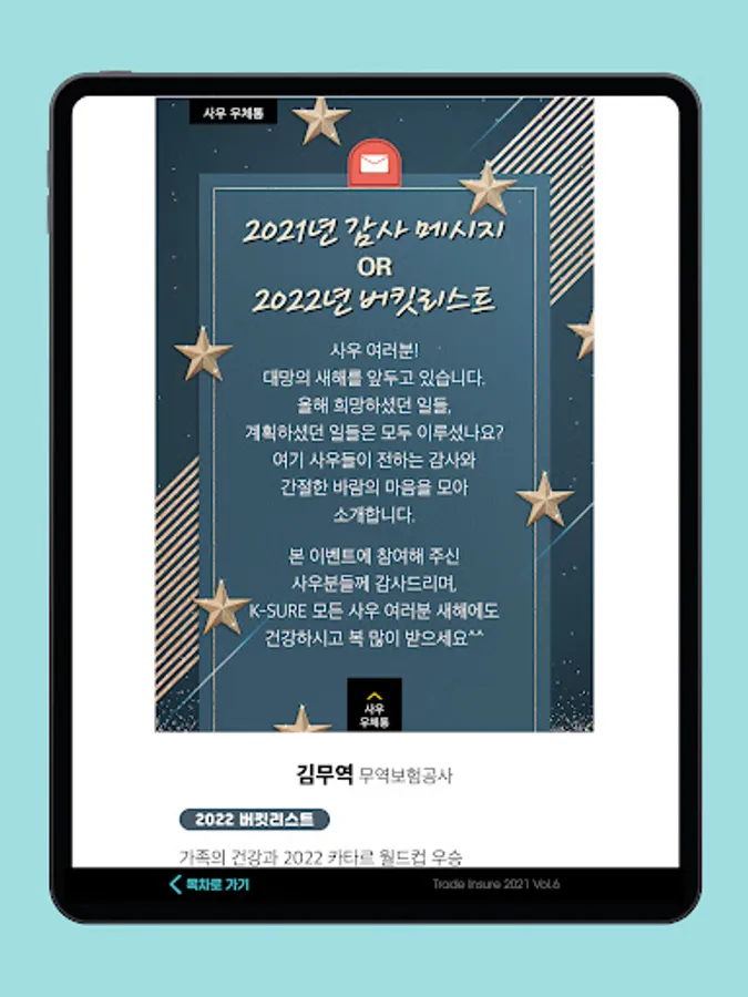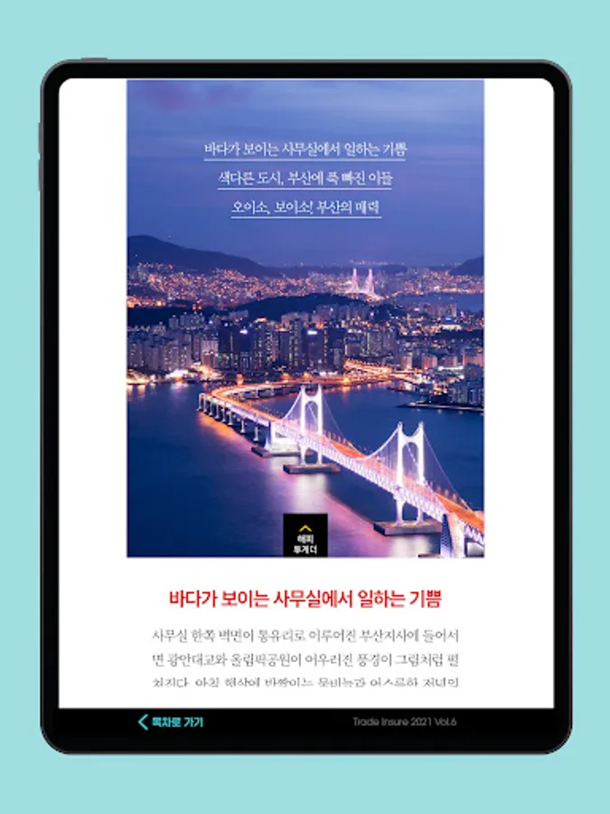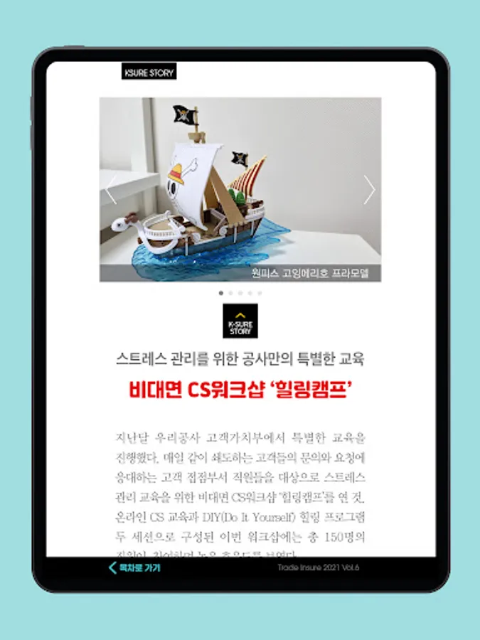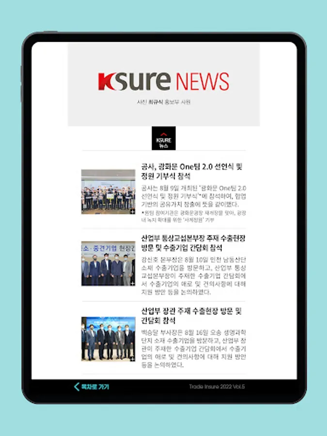 Trade Insure is a mobile app book in the form of an in-house newsletter published bimonthly by the Korea Trade Insurance Corporation, which plays a pivotal role in leading Korean export companies to the global market. It is uploaded on the 10th of every even-numbered month, and various contents are provided each time, such as introductions to each department, visits to domestic and foreign branches, external events and news, issue-related interviews with corporation employees, in-house clubs, employee participation events, and community introductions that can be shared by employees. It is operated as a communication window between the two.