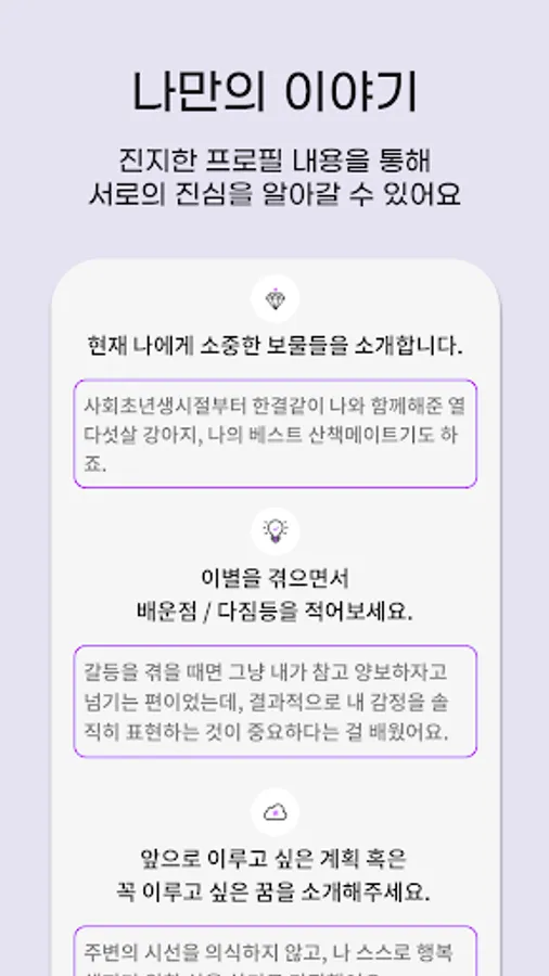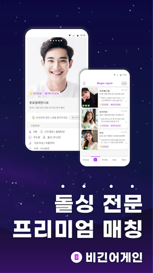 - Thorough subscription screening: It is not a blind date app that anyone can sign up for. You can sign up for Begin Again only when you go through a final screening after carefully writing an honest story about yourself in order to meet true dolsings as well as secure identity verification.