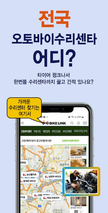 With location-based service, you can find the nearest motorcycle repair center near your current location.