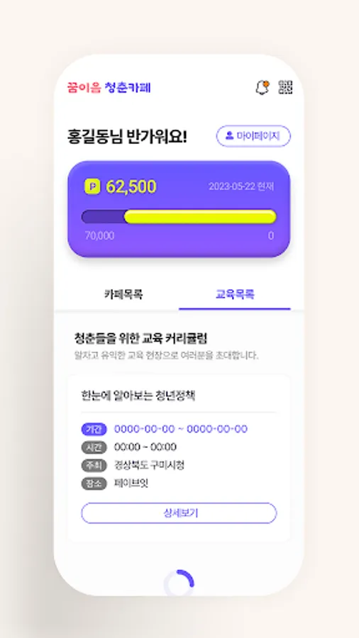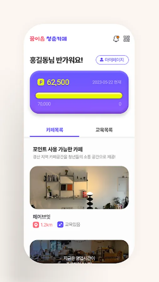 It is a mobile application for young people in Gyeongsangbuk-do who have applied for a dream cafe participant. You can check dream cafes in the area and purchase drinks and desserts using points paid by local government business execution agencies. You can check and participate in employment/startup training schedules at cafes and business organizations.