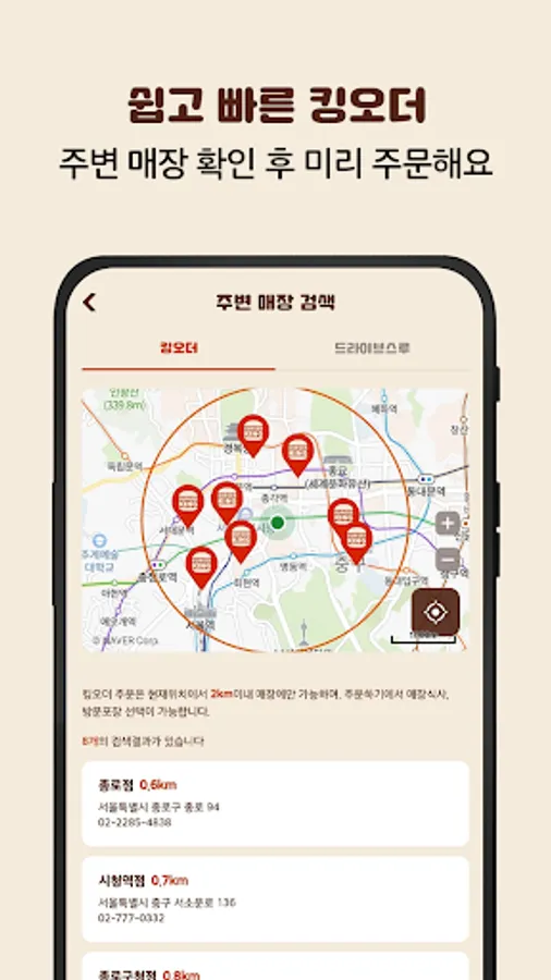 If you touch King Order in the app, you can immediately check nearby stores where drive-thru service is available.