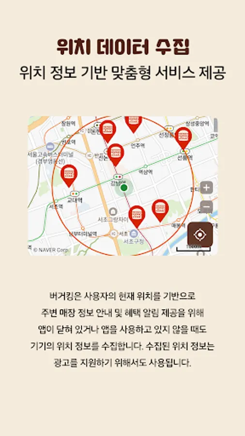 -Location: Based on your current location, Burger King collects your device's location information to provide nearby store information and event notifications even when the app is closed or not in use. The location information collected is also used to support advertising.